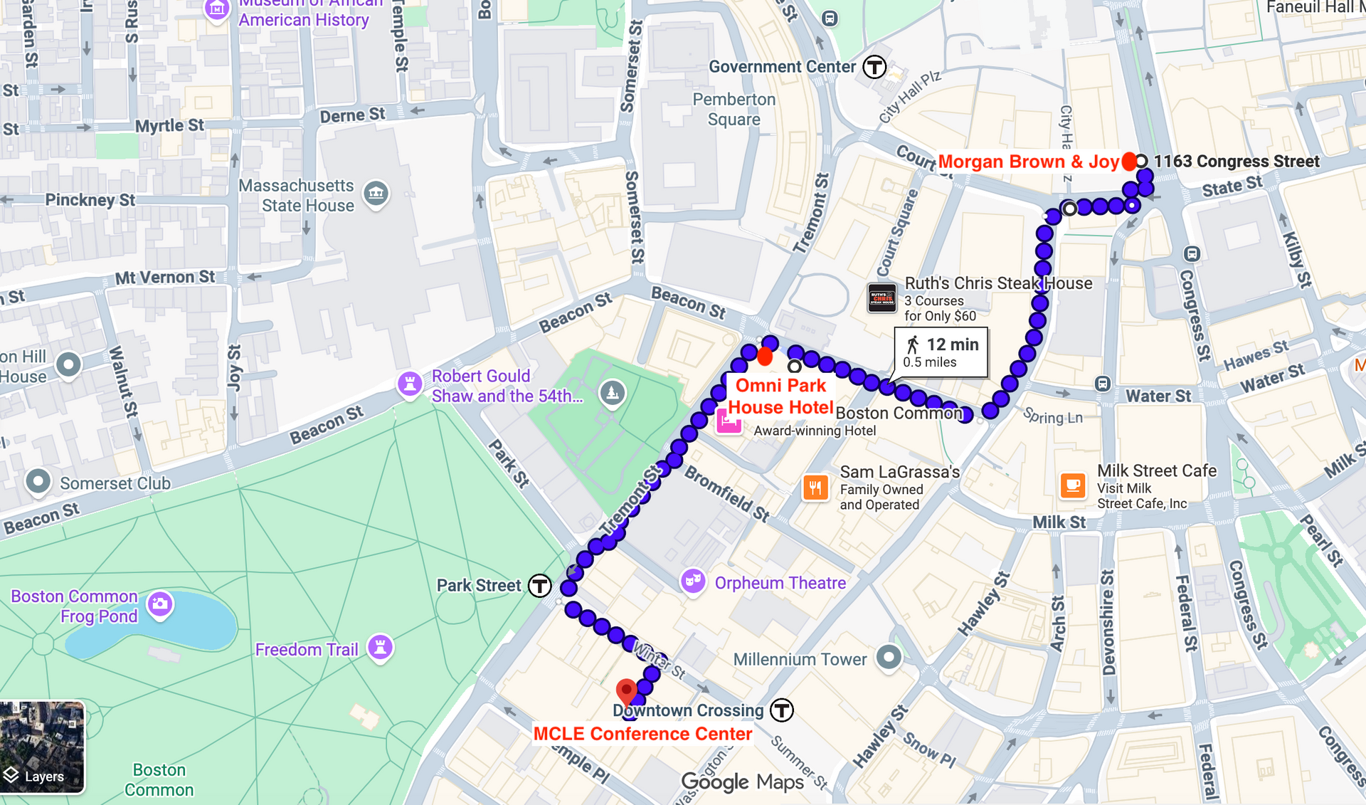 NOTE: If you use GPS to get to the above locations, please enter the address rather than the name of the location. For MCLE, please search 10 Winter Place, Boston; and for Morgan Brown & Joy, please search 28 State Street, Boston.